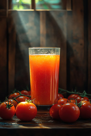 Fresh tomato juice in a glass with whole tomatoes, rustic wooden background, dramatic lighting