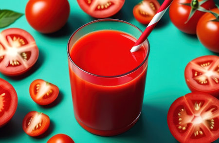 Fresh tomato juice with a stylish striped straw, surrounded by ripe tomatoes on a vibrant teal backdrop. Perfect for a healthy lifestyle promo. Generated A.I.