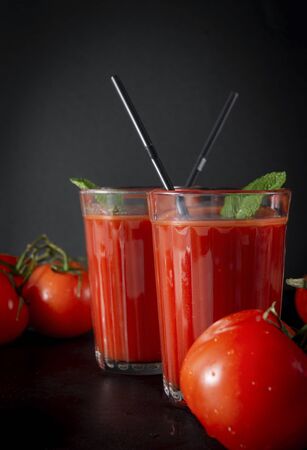 2 glasses of tomato juice with mint and tubes, fresh red tomatoes on a black background, copy space,