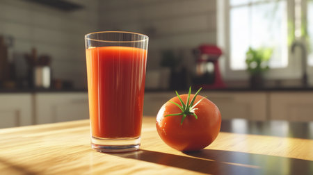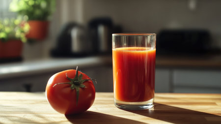 A close-up of a glass filled with fresh tomato juice and a tomato beside it, set on a wooden surface in a bright kitchen