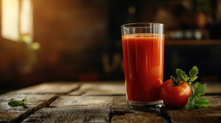 A tall glass of freshly made tomato juice with a whole tomato on the side, on a rustic wooden table under warm light
