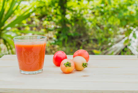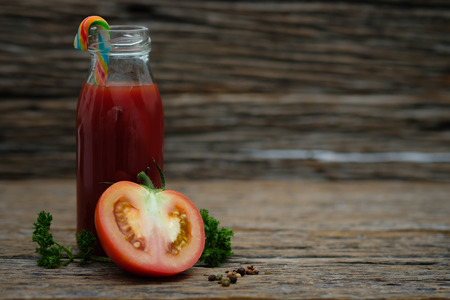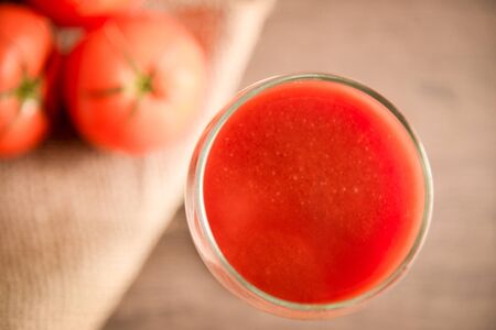 Still life of fresh ripe tomatoes juice on wooden background, Choose focus point. Good health concept.