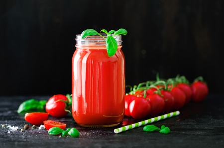 Organic fresh tomato juice in a glass jar, basil, cherry, salt, pepper and straw on dark black background. Clean eating and diet concept. Copy space.