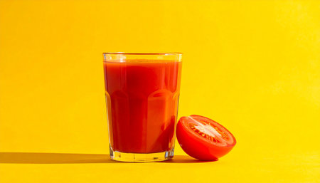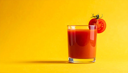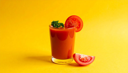 Tomato juice in a glass on a bright yellow background. Copy space.