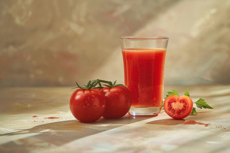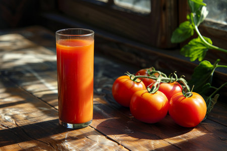 Fresh Tomato Juice and Ripe Tomatoes in Sunlight.