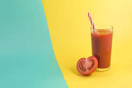 Fresh tomato juice in a transparent bowl and half a tomato on a divided yellow-green background place for text
