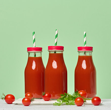 Glass bottles with red caps filled with tomato juice and decorated with green striped paper straws. Green background