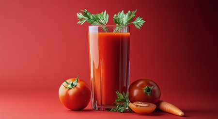 A refreshing glass of blended carrot and tomato juice stands prominently with a bright red backdrop. Beside the glass, a fresh carrot and a ripe tomato add a touch of color and emphasize the healthy ingredients used in the drink.