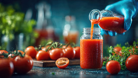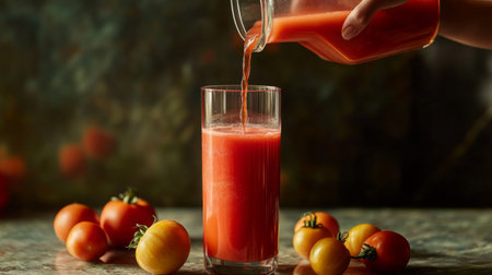 A refreshing glass of fresh tomato juice is poured from a jar, surrounded by ripe tomatoes on a rustic table, capturing the essence of healthy living.