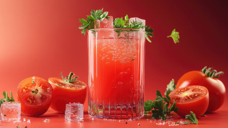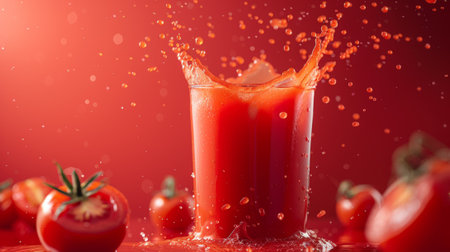 tomato juice splashes in mid-air against a vivid red backdrop, embodying a lively and refreshing beverage idea