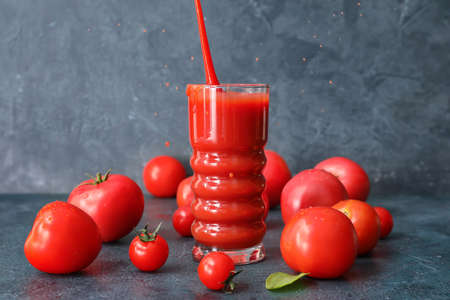 tasty tomato juice in a glass decorated with tomatoes on a gray background