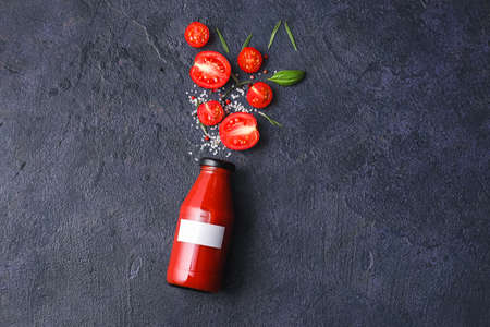 Bottle of tasty tomato juice on dark background