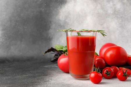 Glass of tasty tomato juice on gray background