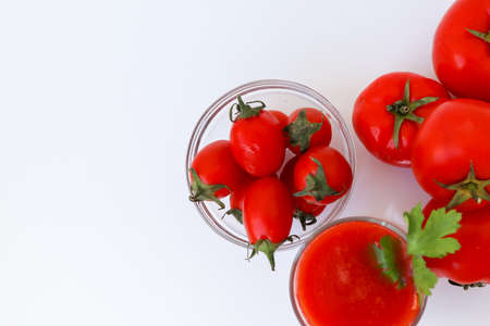 Tomato juice in a glass and fresh tomatoes on a white background