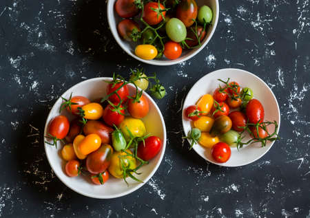 Organic multicolored untreated tomatoes on a dark table, top view with copy space