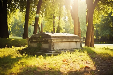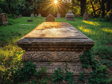 The warm sunlight bathes a headstone in a cemetery, casting a peaceful glow over the solemn space.