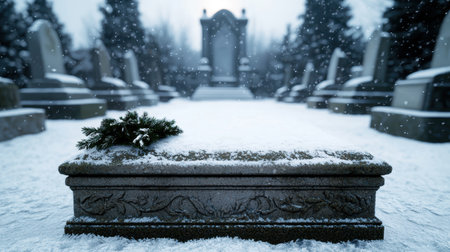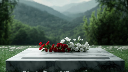 A solemn memorial site with a marble headstone, fresh flowers, and a peaceful setting, capturing themes of loss, remembrance, and respect.