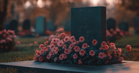 Tombstone Adorned with Red Flowers at Sunset, Evoking Themes of Remembrance and Loss.
