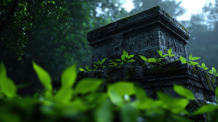 A stone structure with green leaves growing on it. The leaves are covering the stone, giving it a natural and peaceful appearance. The scene is set in a lush, green forest