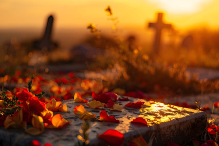 Old cemetery with tombstones and flowers, selective focus, shallow DOF.