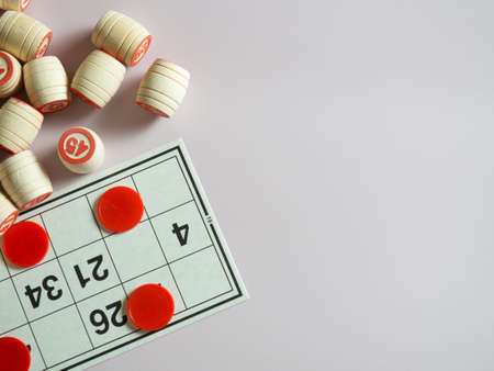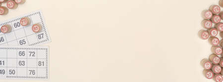 Banner with place for text. Card for playing lotto or bingo and many wooden barrels with numbers. Board game. Concept of leisure at home with family. Copy space. Beige background