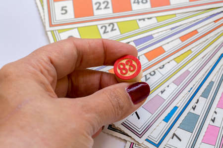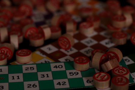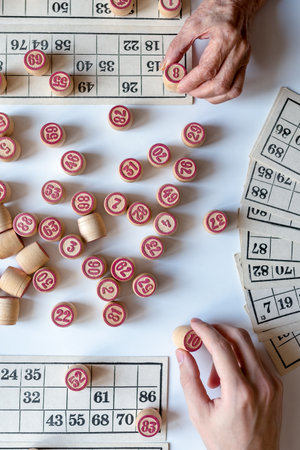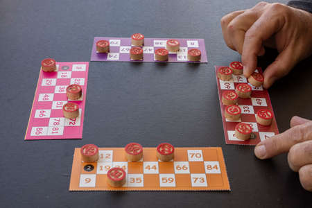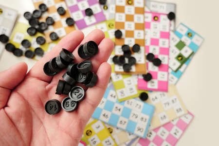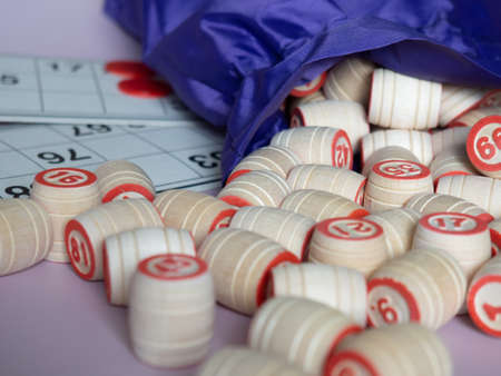Lotto or bingo game. Wooden kegs with cards for playing bingo or lotto. Spending time during quarantine. Old game with wooden elements. The concept of leisure at home in isolation with the family.