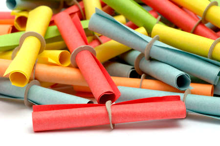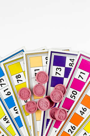 Colorful bingo game cards and numbers on white background, close up, isolated.
