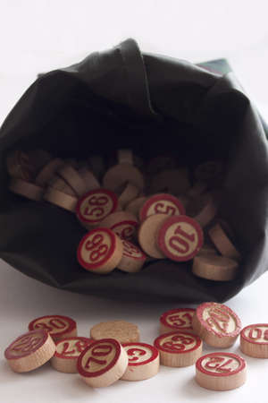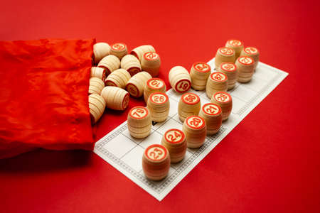 Wooden bingo kegs, on a red background in a red bag, for playing bingo. A way to spend time at home. 2021. High quality photo