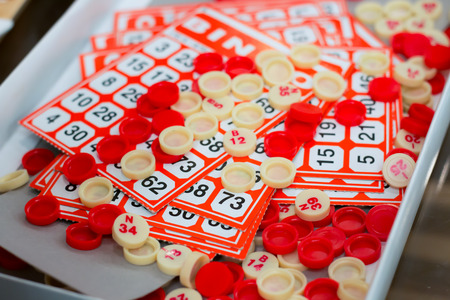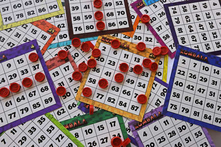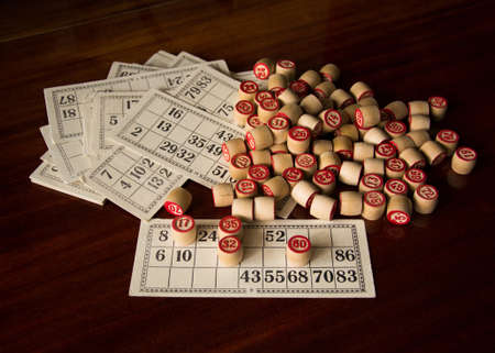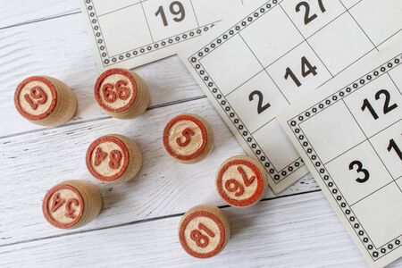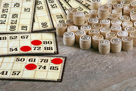 Many barrels with numbers and cards for lotto or russian bingo table game on wooden surface. Russian lotto has similar rules to classical worldwide bingo game