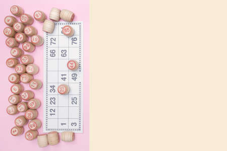 Card for playing lotto or bingo and many wooden barrels with numbers. Beige and pink background with place for text. Copy space. Advertising. Flat lay. Leisure with family.