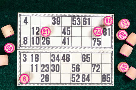 Lotto, classic family board game. Several wooden barrels with numbers and two cards on a green velvet surface during the game. Vintage game, bingo.
