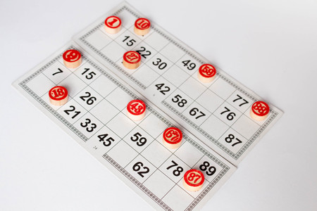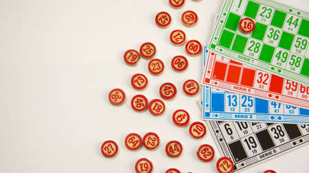 Russian lotto on a white background. Lotto game. Flat lay, top view.