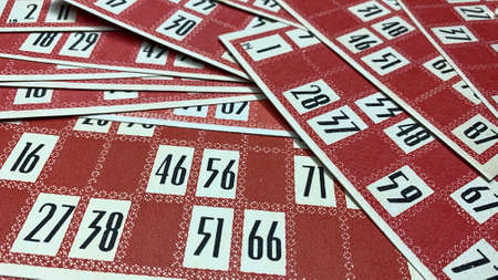 Wooden bingo kegs, on a red background in a red bag, for playing bingo. A way to spend time at home. A game of chance, card with numbers. . High quality photo