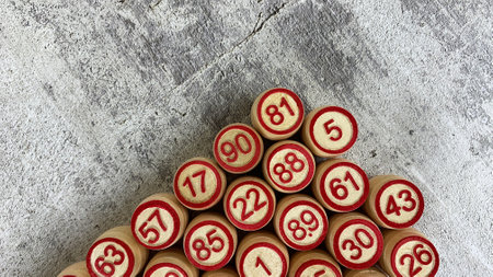Lotto game. Wooden lotto barrels and card on a wooden table.