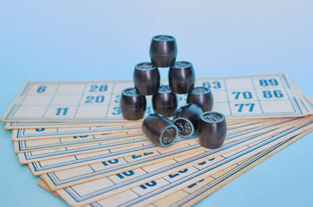 Board game bingo. Wooden barrels with lotto numbers, playing cards for the game. Close up.