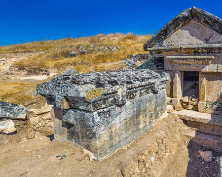 Necropolis detail with sarcophagus in Pamukkale (ancient Hierapolis), Anatolia, Turkye.