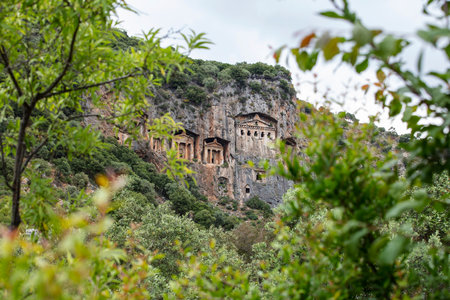 Ancient Lycian rock tombs carved into cliff in Fethiye, Turkey. Historic archaeological landmark surrounded by mountains and nature, popular travel destination.