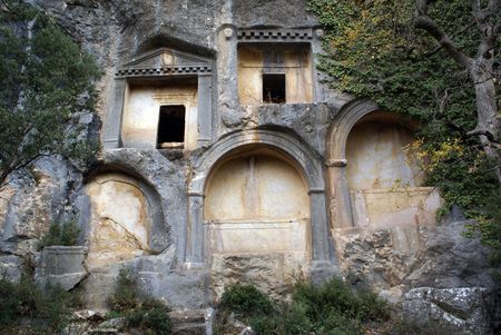 ancient tombs and crypts carved into the rocks in the ruins of Myra of Lycia