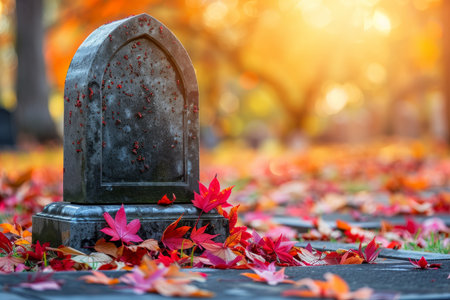 a weathered gravestone surrounded by autumn leaves, created with generative ai