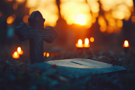 Lit candles on a cemetery at night, warming flames creating a calm and emotional memorial atmosphere among graves.