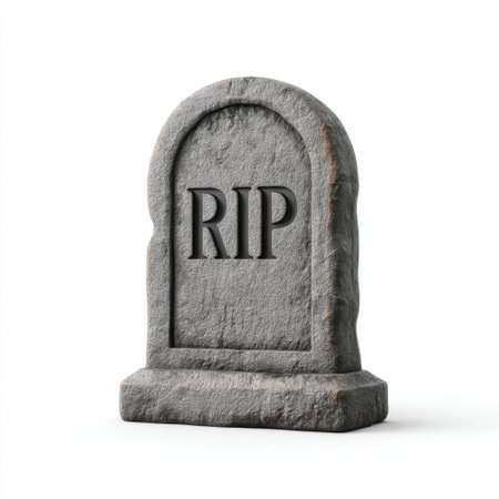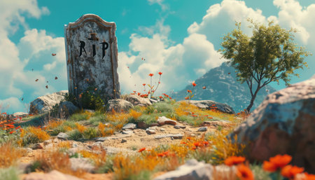 A weathered stone grave marker stands proudly, showcasing a carved RIP inscription. This serene monument captures themes of loss, remembrance, and the passage of time.