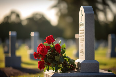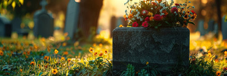 Tombstone Adorned with Red Flowers at Sunset, Evoking Themes of Remembrance and Loss.