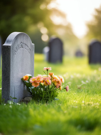 Colorful flowers are tastefully arranged around a grave in a serene cemetery. Soft sunlight filters through the trees, creating a peaceful atmosphere during autumn