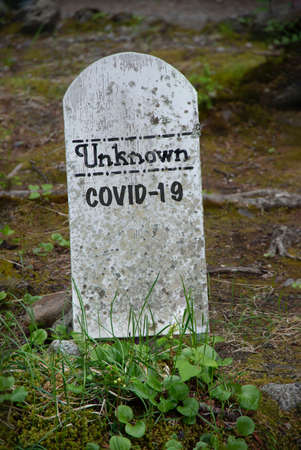 Old dirty tombstone with Unknown written on the top and COVID-19 written under it