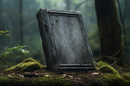 A black and white frame with moss growing on it. The frame is empty and has a sense of loneliness and decay