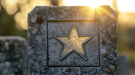 An enchanting close-up of an old gravestone with a star symbol, bathed in warm sunlight, perfect for conveying themes of memory, history, and peaceful reflection.
