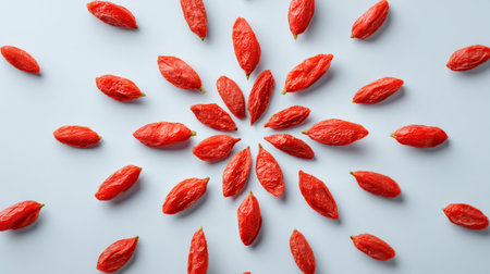 This image showcases a stunning arrangement of fresh goji berries in a vibrant radial pattern, highlighting their bright color and healthy appeal in food photography.