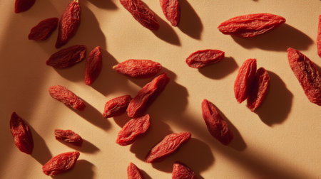 Discover a visually appealing arrangement of vibrant dried goji berries, showcasing their unique texture and natural color on a neutral backdrop, ideal for nutrition themes.
