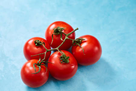 Bunch of fresh tomatoes with green leaves isolated on blue background, top view, close-up, selective focus. Delicious healthy appetizer. Fresh gourmet ingredient. Spring food background. Dietary product. Healthy food concept.