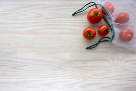 tomatoes in a reusable bag on a light coloured background